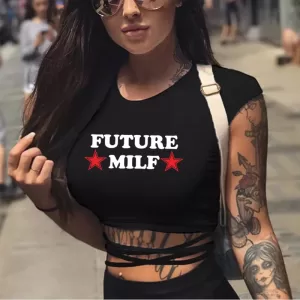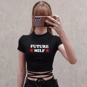 FUTURE MILF Stars Sexy Crop Tops Letter Print Short Sleeve Summer Women Black Short T-Shirts Bandage Tee Tops Female ShirtsFUTURE MILF Stars Sexy Crop Tops Letter Print Short Sleeve Summer Women Black Short T-Shirts Bandage Tee Tops Female Shirts