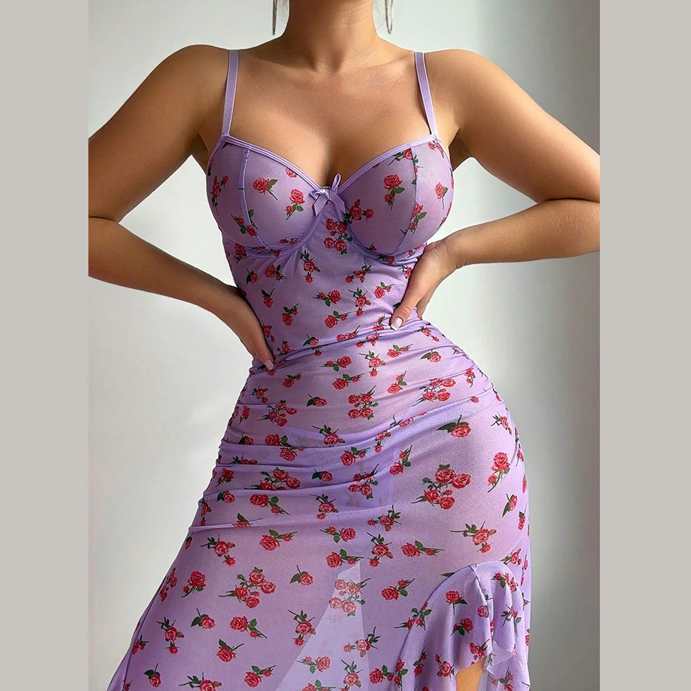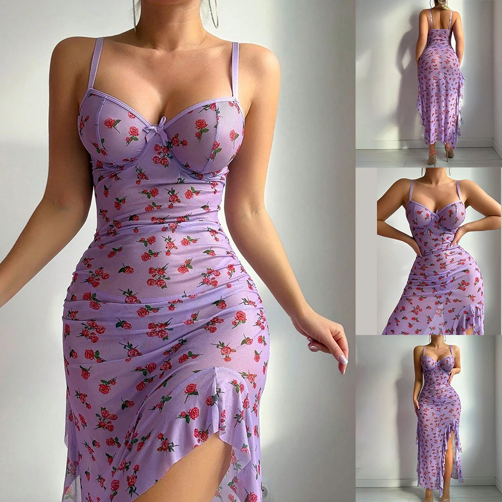 butterfly printed nightgown — Embrace effortless comfort and feminine style with the Slim Slit Butterfly Printed Nightgown. Crafted from a soft stretch blend of 95% polyester and 5% spandex, this ankle-length, spaghetti-strap nightdress features a delicate butterfly print, a slim side slit, and a sleeveless, flattering silhouette that moves with you. The lightweight, tatting-knit fabric keeps the dress breathable for year-round wear and is ideal for relaxed evenings at home, hotel stays, or restful nights. Each package includes one nightdress and a coordinating pair of briefs, both brand new and free from high-concern chemicals.