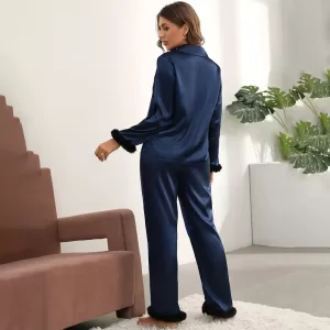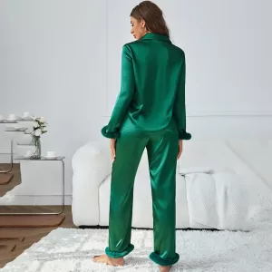 Spring Female 2PCS Pajamas Set with Feather Loose Casual Sleepwear Long Sleeve Trouser Suits Green Satin Home Wear LoungewearSpring Female 2PCS Pajamas Set with Feather Loose Casual Sleepwear Long Sleeve Trouser Suits Green Satin Home Wear Loungewear