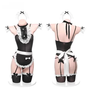 Women Lace Perspective Maid Dress Body-Stocking Backless with Garter Belt Sexy Lingerie Maid Temptation Sleepwear Porno Babydoll
