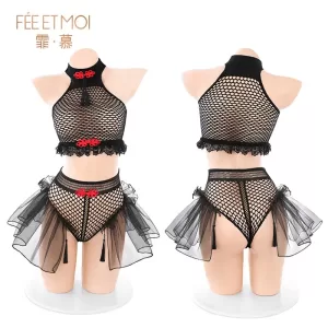 Enhance your seductive charm with this sexy black fishnet lingerie set. Designed with a cheongsam-inspired look, it features lace accents and hollow-out details that create a captivating and elegant appearance. The set includes a top and short skirt, made from comfortable net cloth. Designed to fit busts from 80-110cm, waists from 60-102cm, and hips from 80-110cm, this one-size set accommodates sizes S-XXL. Ideal for exotic apparel or cosplay events, this lingerie adds a touch of classic temptation to your wardrobe. Note that the headband is not included.
